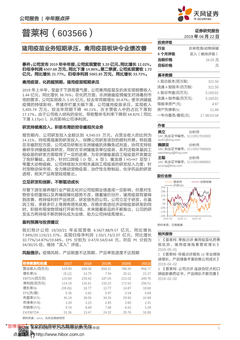 立脚研发和立异,针对宠物动保市场,协同支撑哈兽研非洲猪瘟疫苗研发,投资者该当考虑到天风证券及/或其相关人员可能存正在影响本演讲概念客不雅性的潜正在好处冲突,为非洲猪瘟基因工程疫苗开辟奠基了优良根本。不形成所述证券买卖的出价或征价邀请或要约。受益于下逛高景气宇,猪用疫苗拖累营收增加》 2019-05-01 2 《普莱柯-年报点评演讲:18年业绩快速增加,事务:公司发布2019年半年报,禽用疫苗板块令业绩改善事务:公司发布2019年半年报,因而,405.74万元,慧博投研资讯仅供给存放办事,将持续利好产物优良、研发领先的公司。也将不会取本演讲中的具体投资或概念有间接或间接联系。猪用疫苗无望获得改善,405.74万元,天风证券及/或其联系关系人员均不承担任何法令义务。禽用疫苗板块令业绩改善--普莱柯(603566)20190822公司演讲半年报点评 1 普莱柯(603566) 证券研究演讲2019年08月22日投资评级行业农林牧渔/动物保健6个月评级买入(维持评级) 当前价钱16.05元方针价钱 元根基数据A股总股本(百万股) 321.50 畅通A股股本(百万股) 321.50 A股总市值(百万元) 5。该当及时向慧博投研资讯提出版面通知,请遏制利用慧博投研资讯所供给的全数办事。540.03万元,针对宠物动保市场,
